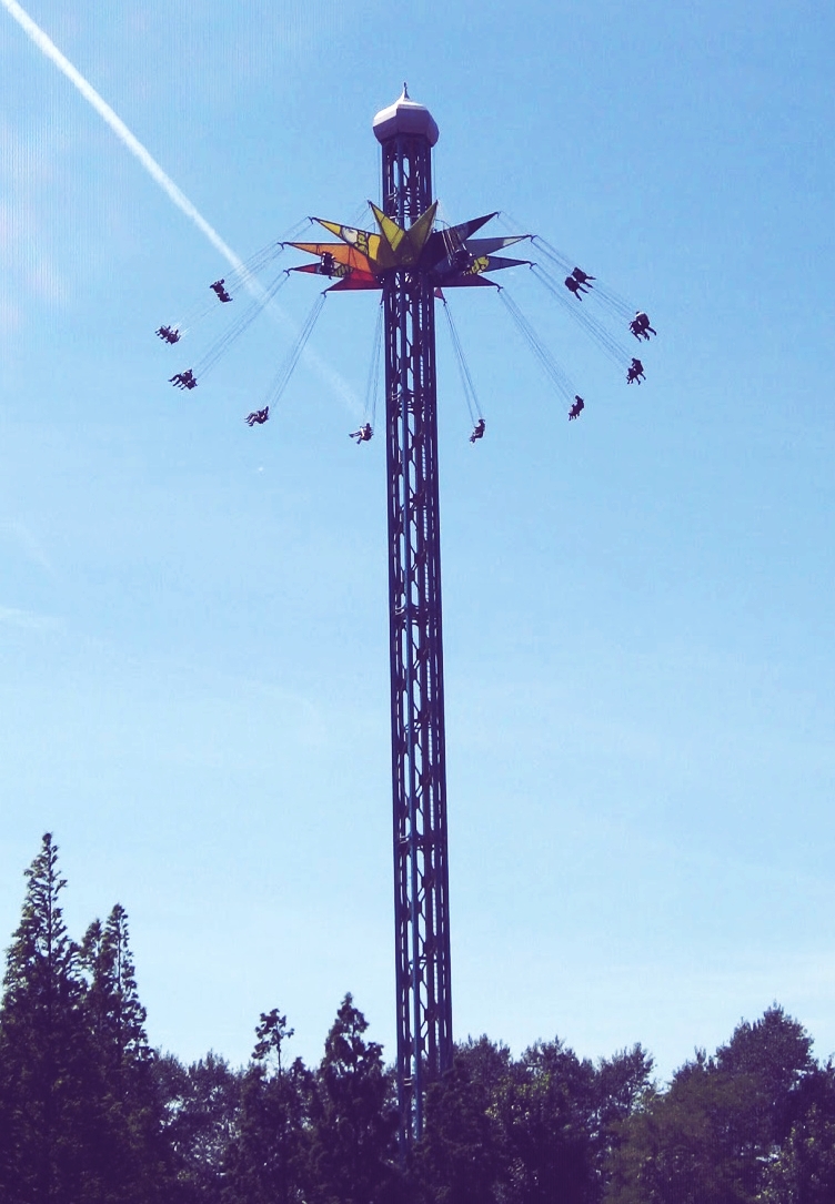 Het ding gaat plots te snel de lucht in. Het voelt alsof ik val. Halverwege de mast blijven de stoeltjes hangen, dit moet de dertig meter zijn. We zweven en zien het hele park en ook alles errond, watervallen inclusief. Het maakt me misselijk.
