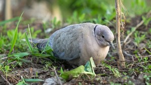 We knikken. ‘Een tortelduifje. Hij kan niet meer vliegen, maar lijkt voor de rest wel in orde.’